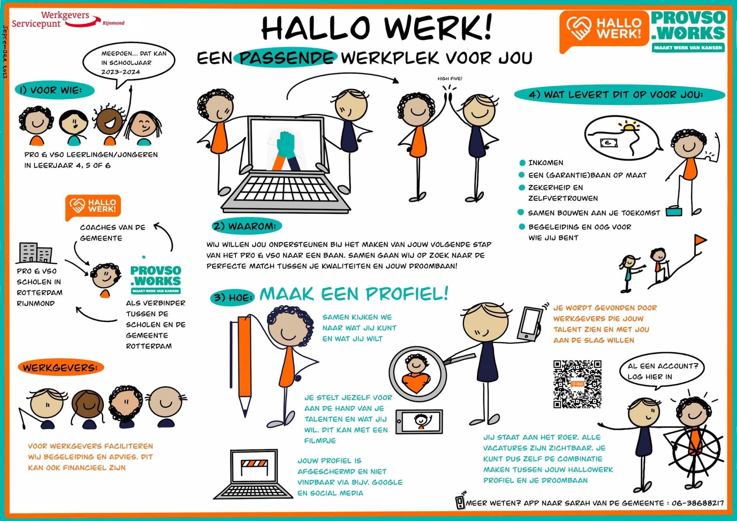 Het pilot project HalloWerk is een samenwerking tussen de gemeente Rotterdam en PROVSO.WORKS. HalloWerk is een matchingsplatform waar leerlingen en jongeren samen met de Jobcoach van de gemeente hun persoonlijke profiel pagina kunnen aanmaken. Op deze profielpagina presenteren de jongeren zich bij werkgevers en laten zij zien wat hun vaardigheden, competenties en behaalde certificaten en diploma’s zijn.