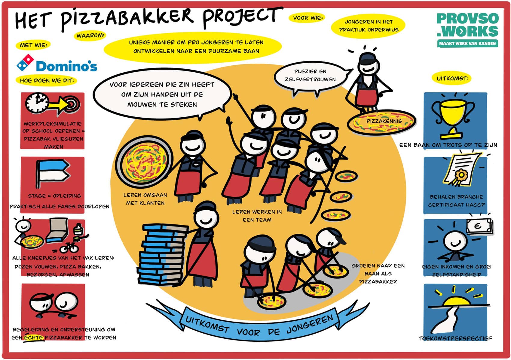 Tijdens de leerperiode werken de jongeren al bij de werkgever in dit project Domino’s pizza. Zo maken zij al kennis met de werkvloer en leren ook de andere facetten kennen en uitvoeren zoals het vouwen van dozen en bezorgen. Na het afronden van de leerperiode als pizzaiolo op school gaan de jongeren aan de slag als pizzabakker. Daar leren zij verder in een dynamische omgeving waar zij ook te maken krijgen met klanten en bestellingen. Ook hier is begeleiding aanwezig.