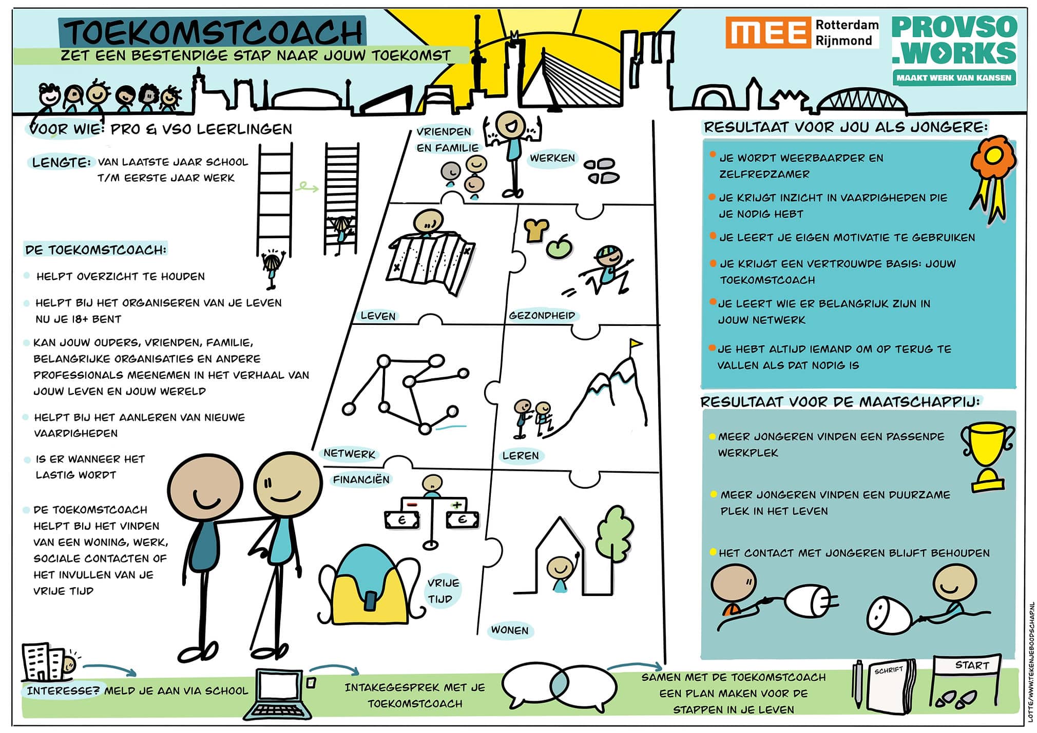 Het project ToekomstCoach is een samenwerking tussen PROVSO.WORKS en MEE Rotterdam Rijnmond. De ToekomstCoach is er voor leerlingen / jongeren in het laatste jaar school en het eerste jaar als werknemer en tijdens de volgende stap in het leven. De ToekomstCoach staat naast de leerling / jongere en ondersteunt bij diverse vragen op de levensdomeinen. Je kan hierbij denken aan vragen die te maken hebben met wonen, werken, leven, leren, sociaal netwerk, gezondheid, financien etc.